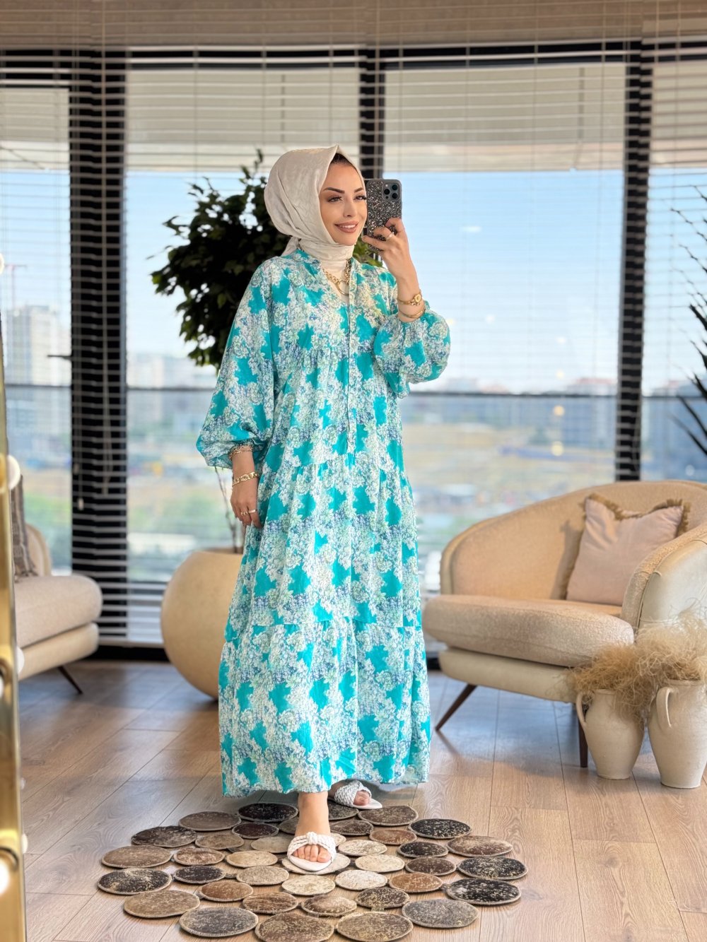 25EL570 Kasımpatı Çiçekli Elbise Turkuaz