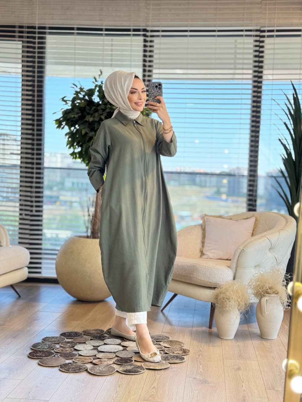 25Y6033 Gofre Fermuarlı Uzun Kap Haki