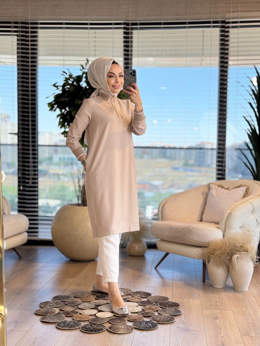 25YT433 Patı Fermuarlı Yaka Kol Ribanalı Tunik Bej