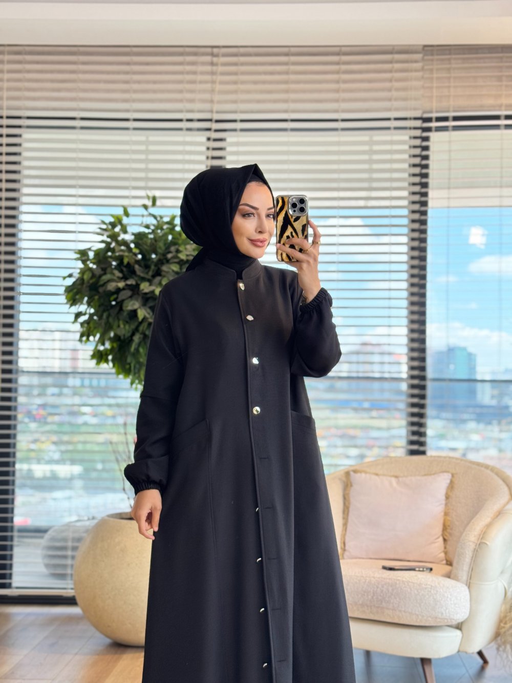 26516 Keten Metal Düğmeli Pardesü Siyah