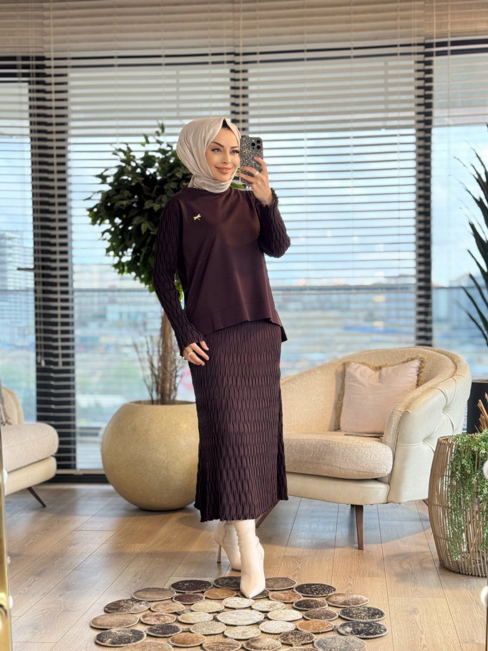 271 Mandal Desenli Triko Etekli Takım Kahve