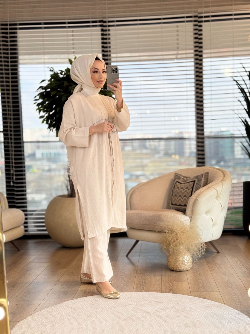 2771 Süs Dikiş Detaylı Bağcıklı Takım Bej