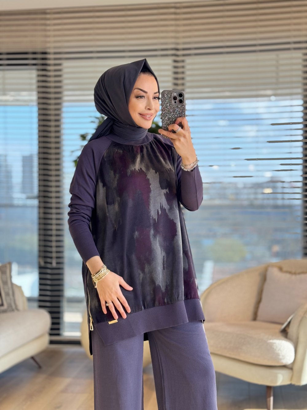279 Kolları Kumaş Desenli Triko Tunik Antrasit
