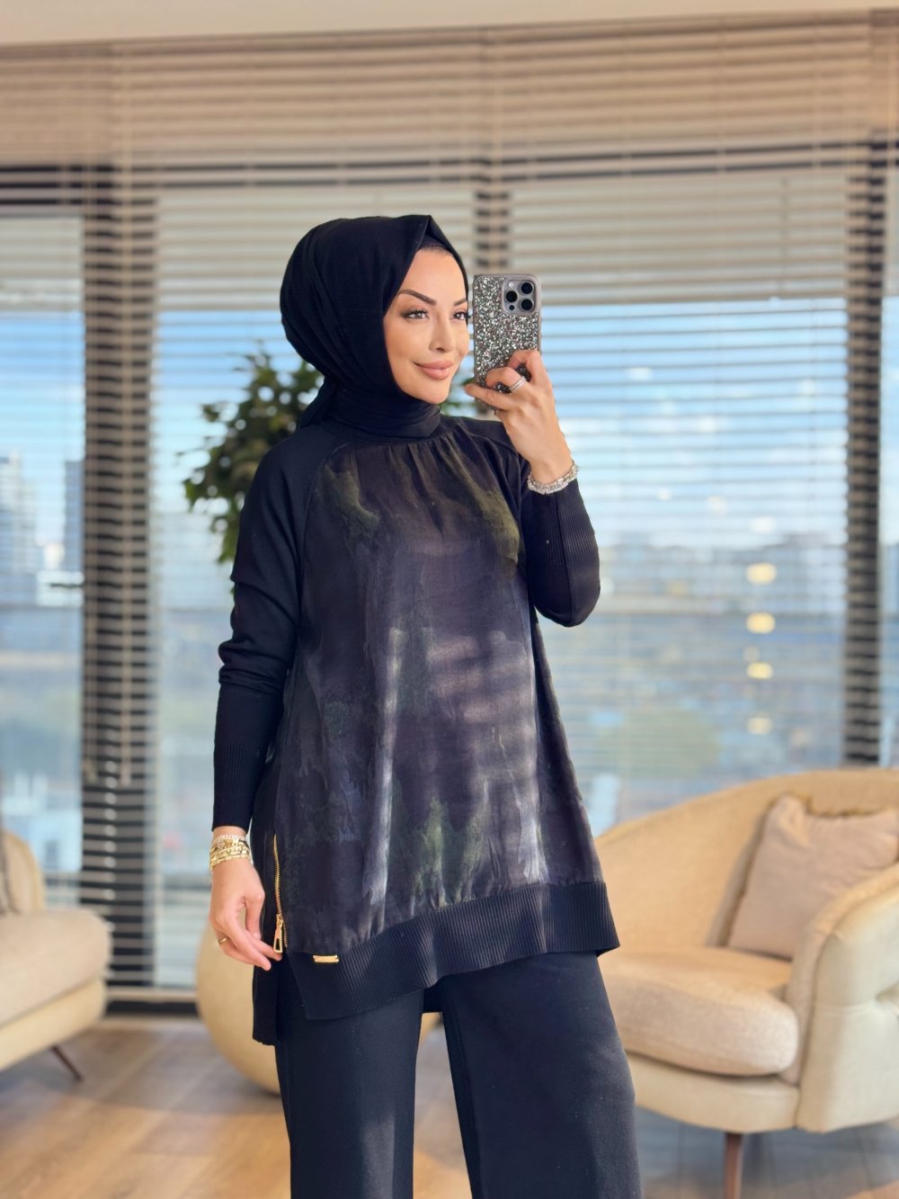 279 Kolları Kumaş Desenli Triko Tunik Siyah