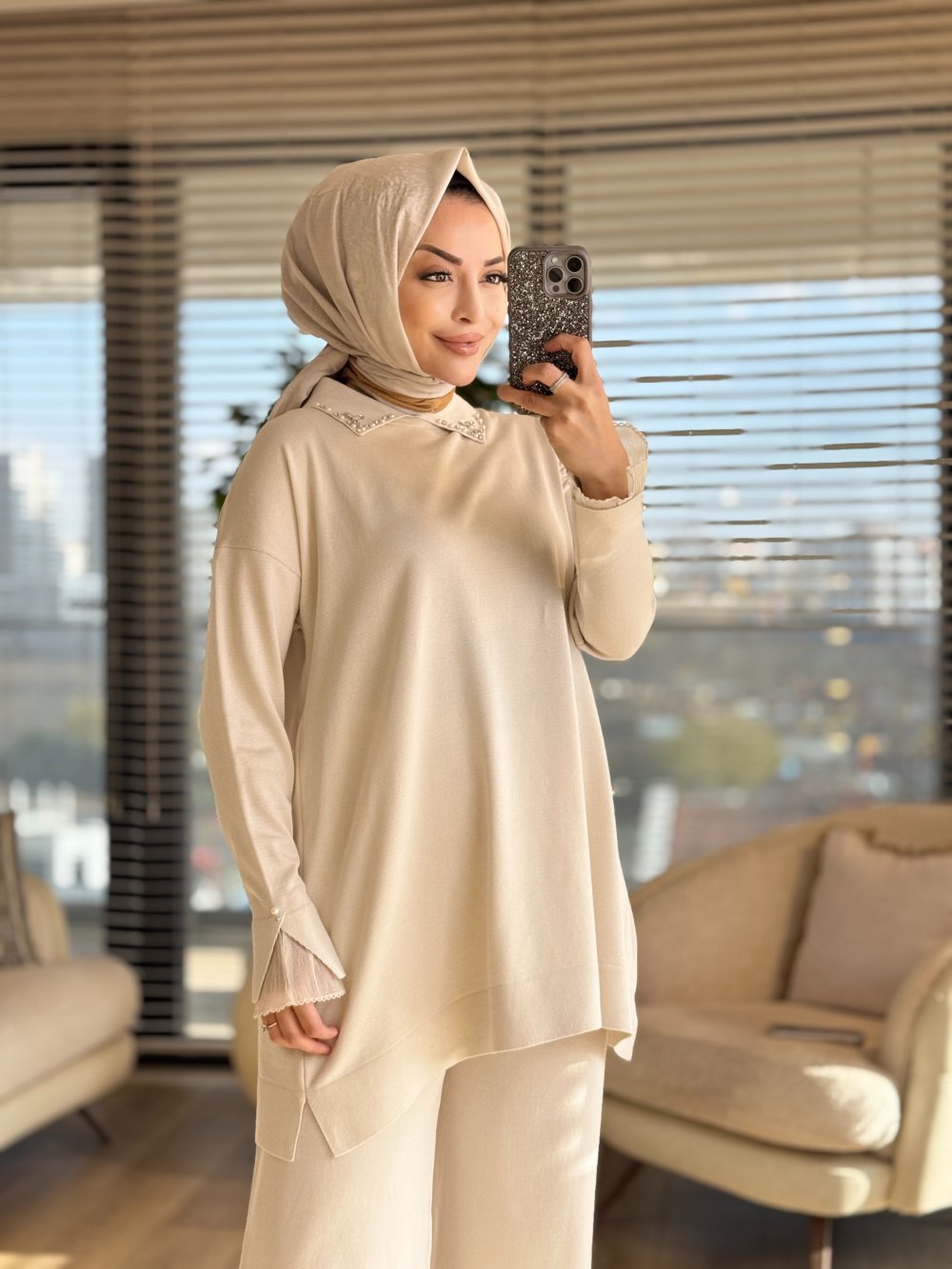280 Kolu Dantelli Yaka Taşlı Triko Tunik Bej