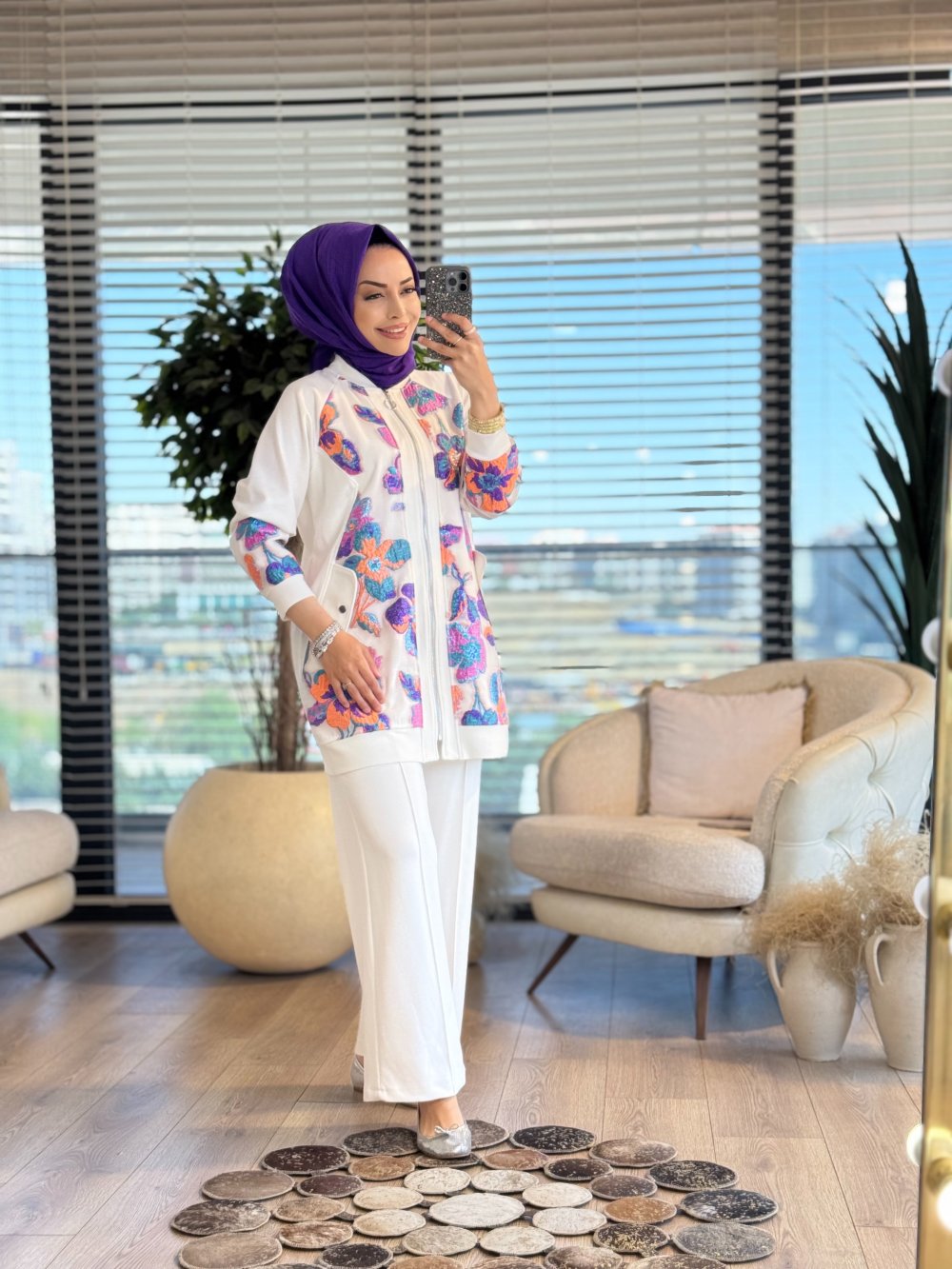 3037 Önü Tül Üstü Kabartma İşli Takım Ekru