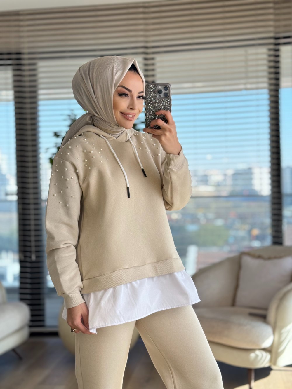 3039 Omuzları İnci İşli İki İplik Takım Bej