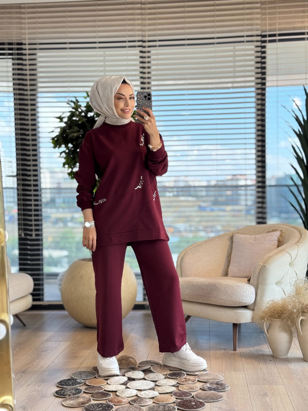 3046 Asimetrik Taş Detaylı Takım Bordo