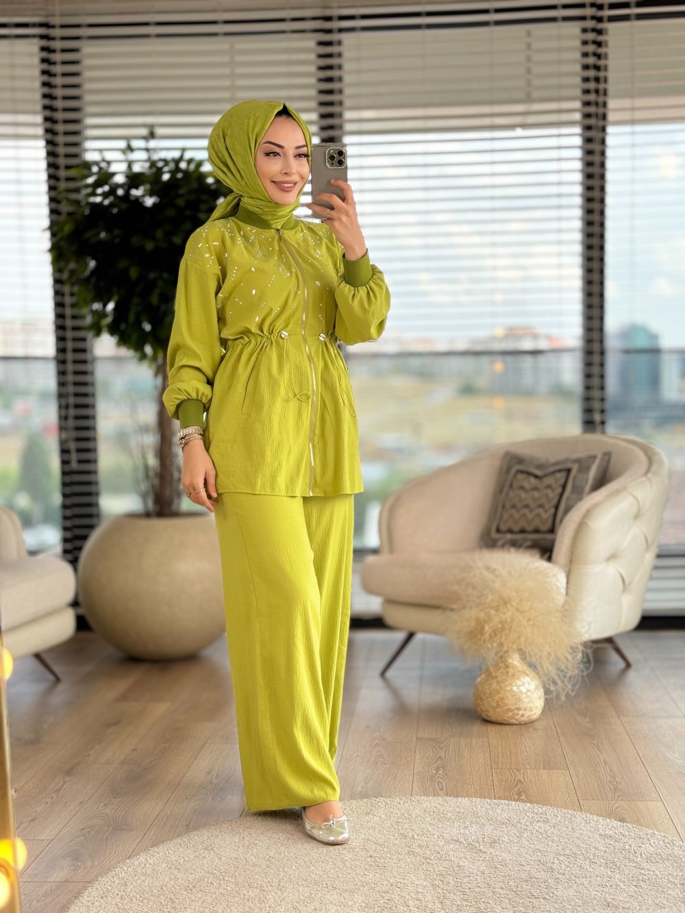 30846 Taş Detaylı Fermuarlı Takım Yağ Yeşili