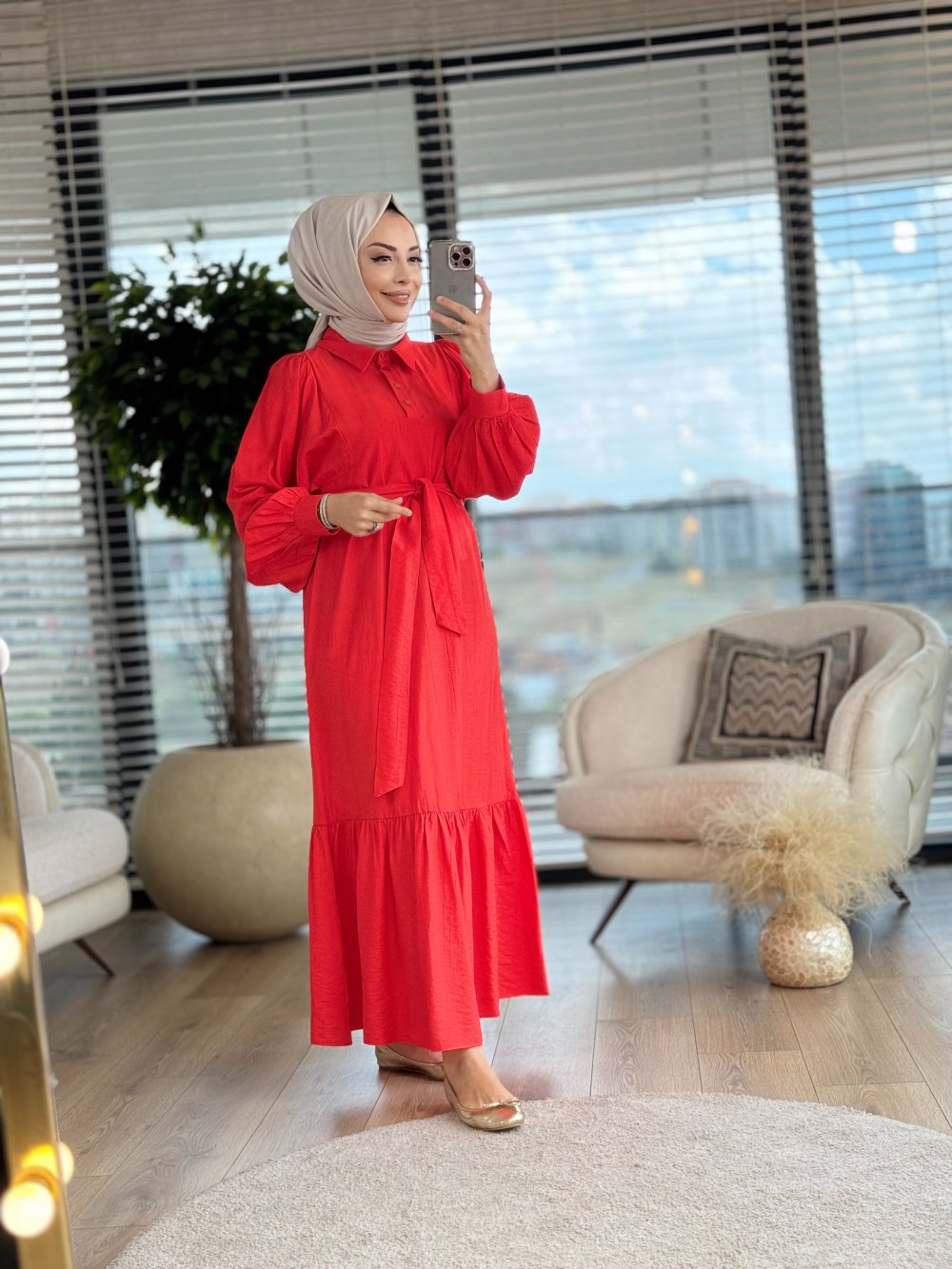 31135 Gofre Patı Düğmeli Elbise Mercan
