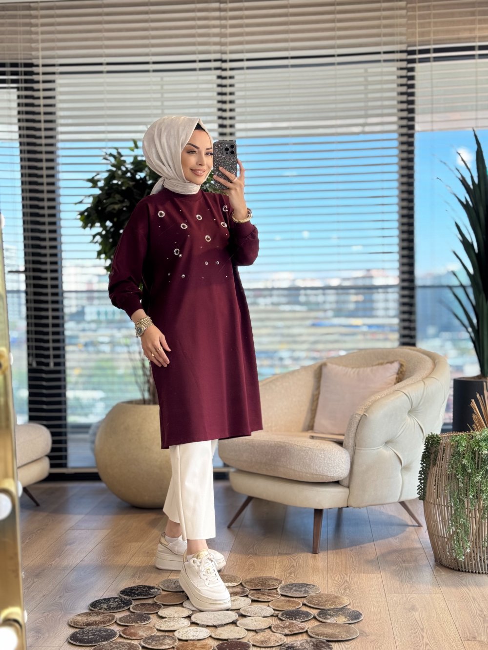 3138 Taş Ve İnci Detaylı Midi Boy SweatShirt Bordo