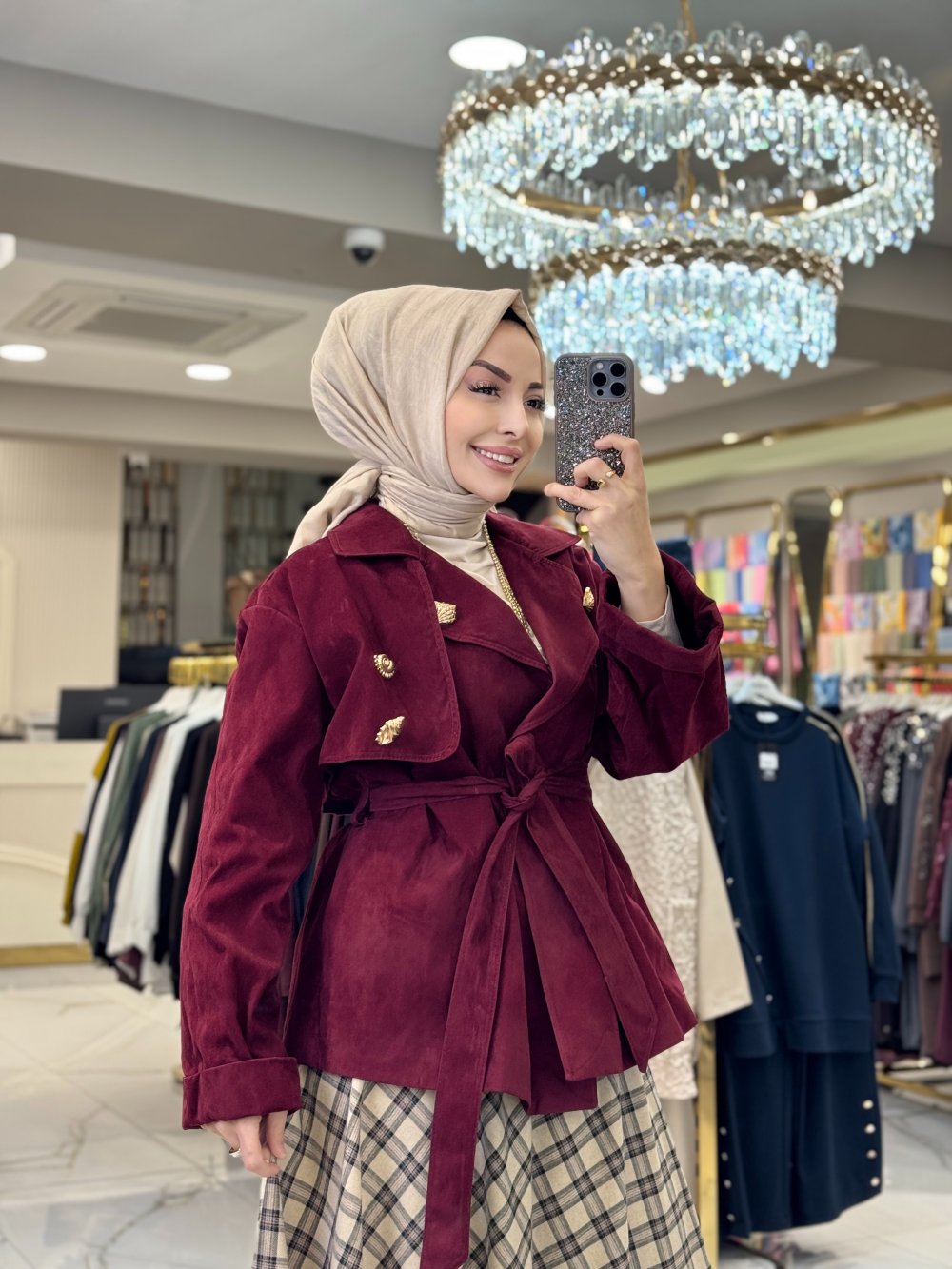 32405 Metal Düğme Aksesuarlı Kısa Trenç Bordo