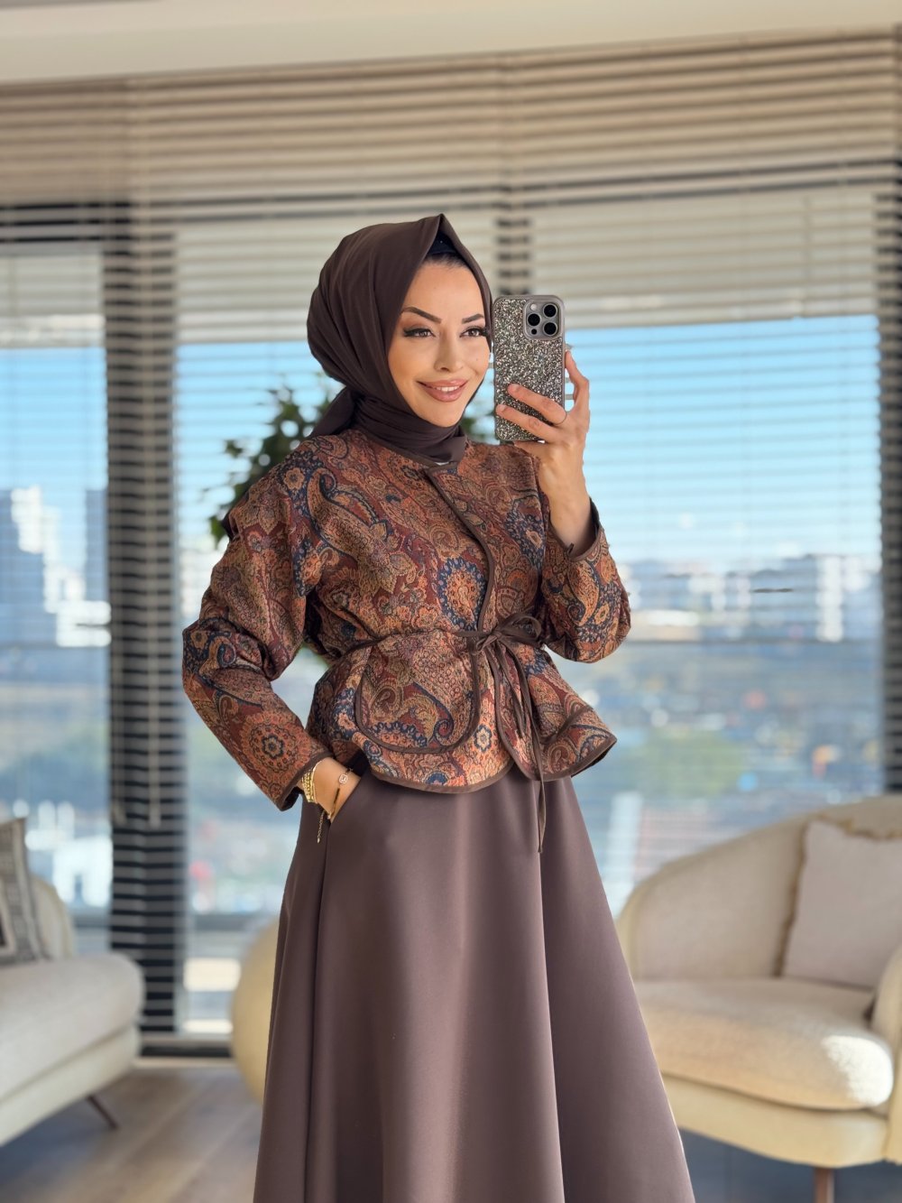32447 Otantik Desen Önden Bağlamalı Ceket Kahve