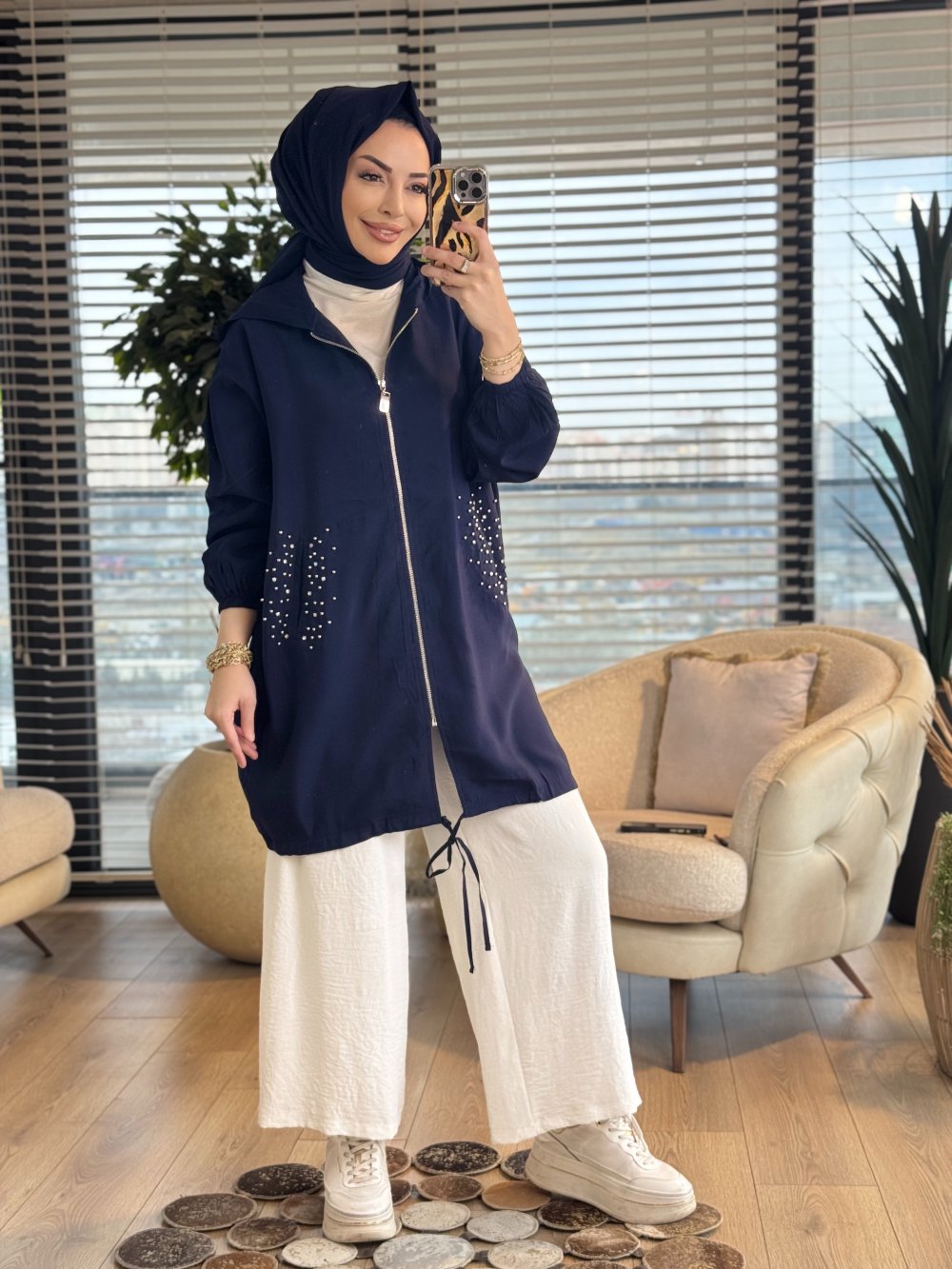 3278 Cepleri Taş Detaylı Midi Boy Kap Lacivert