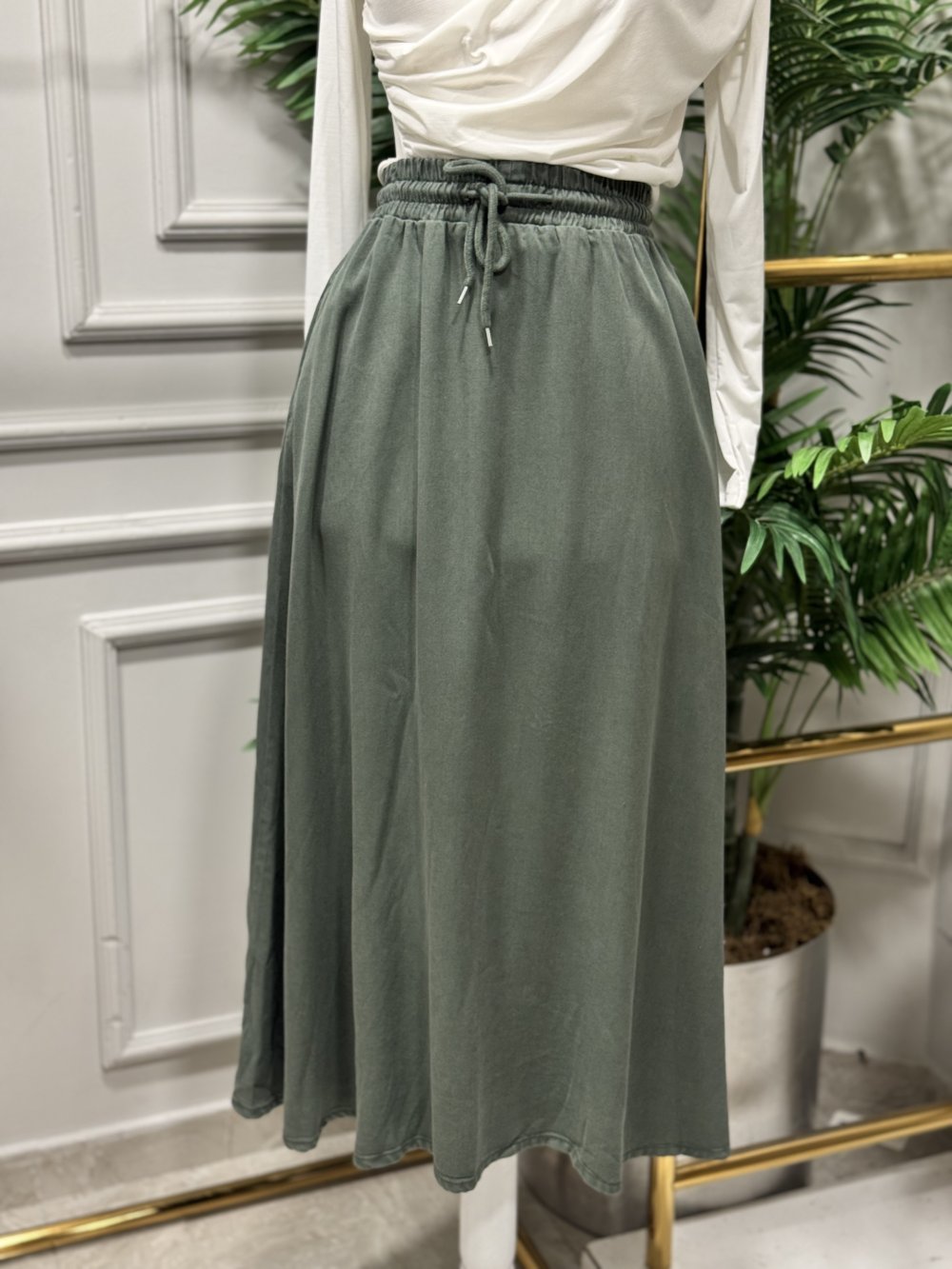 3322 Tencel Beli Lastikli Kloş Etek Haki