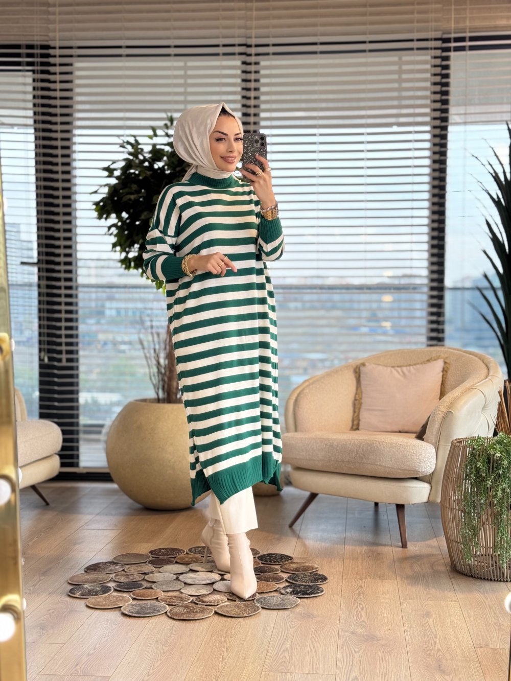 3389 Enine Kalın Çizgili Uzun Triko Tunik Haki