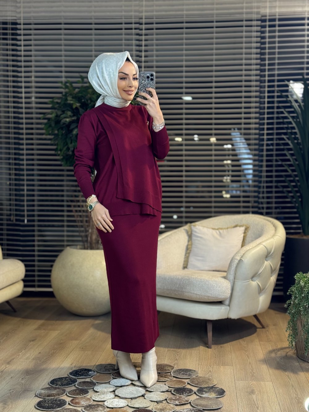 3561 Ön Parçalı Broşlu Triko Etekli Takım Bordo