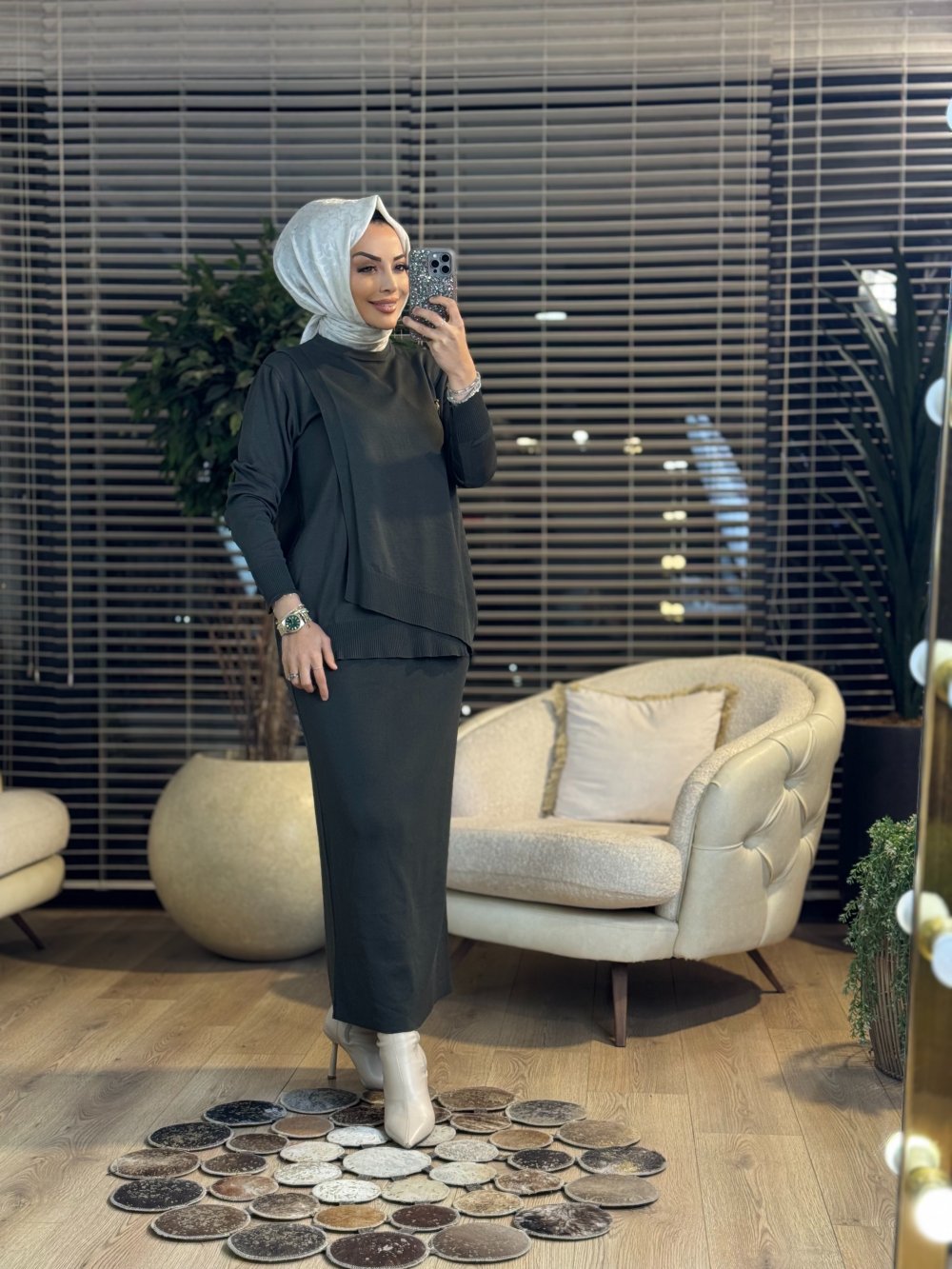 3561 Ön Parçalı Broşlu Triko Etekli Takım Haki