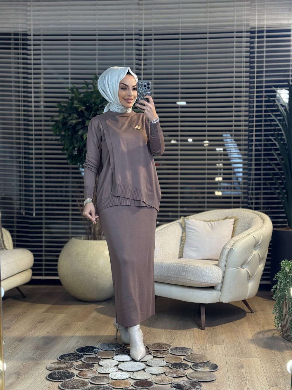 3561 Ön Parçalı Broşlu Triko Etekli Takım Vizon