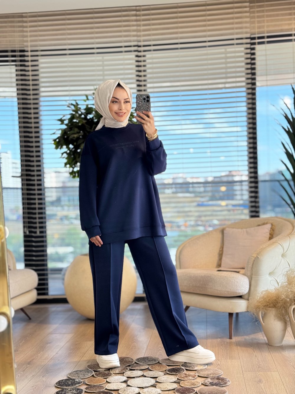 35798 Tonaton Baskı Geniş Paçalı Pantolonlu Takım Lacivert