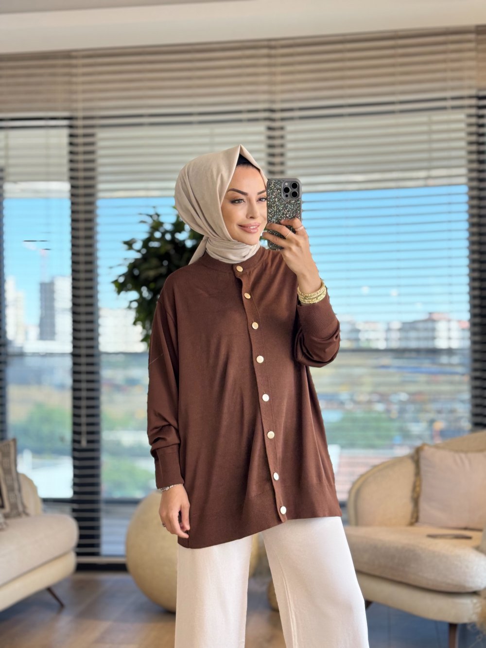 40969 Gold Düğmeli Hırka Kahve