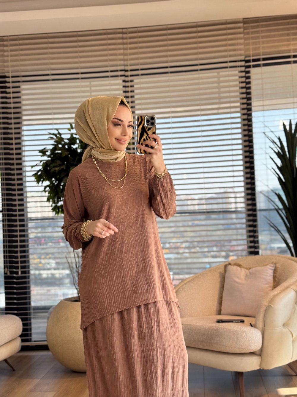 4209 Manolya Kraşlı Etekli Takım Latte