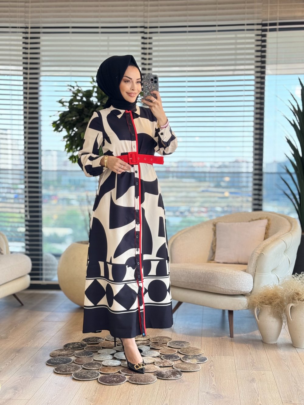 42161 Karışık Oval Desenli Elbise Ekru Siyah