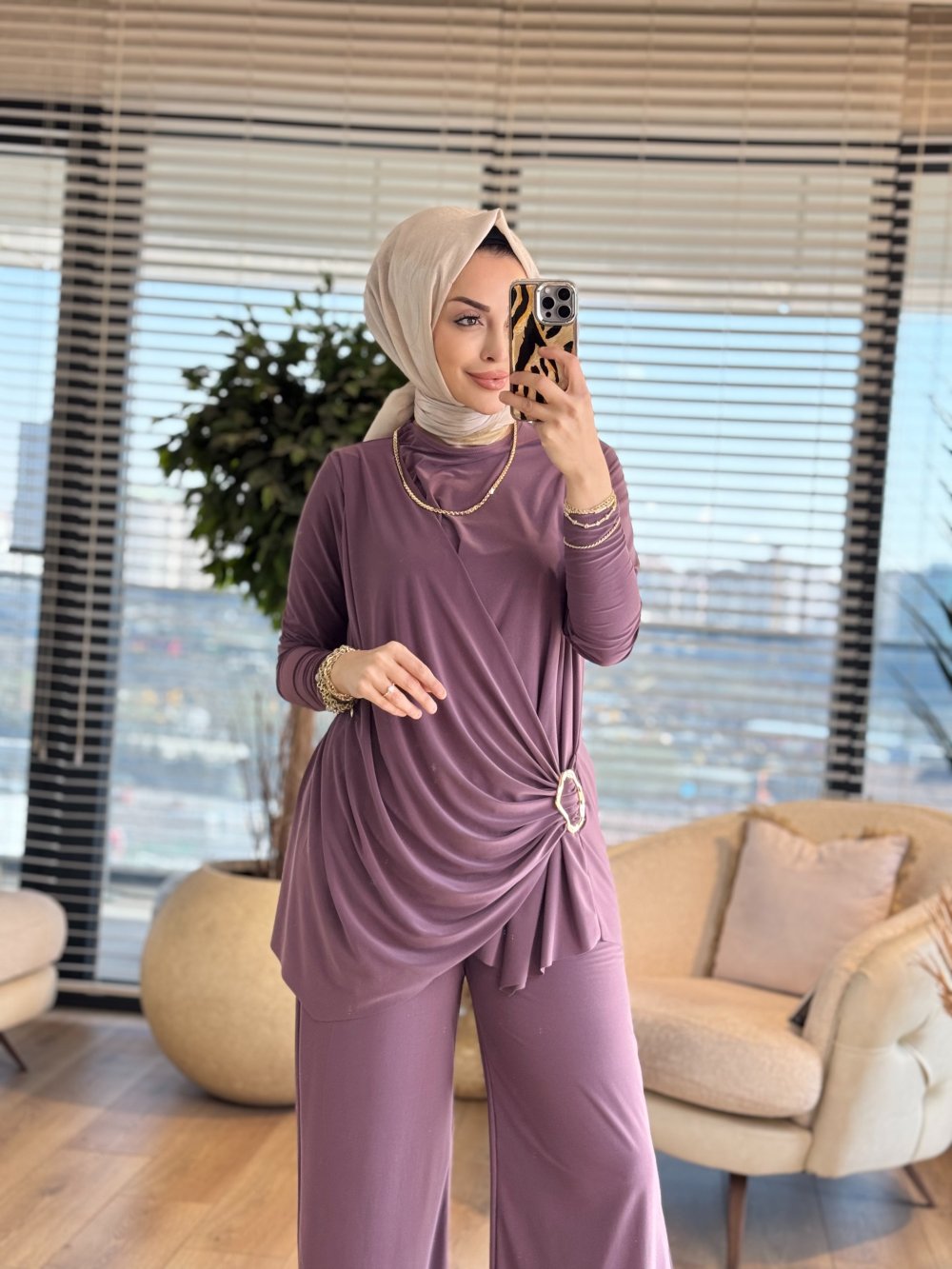 4225 Yanı Toka Büzgülü Pantolonlu Takım Gül