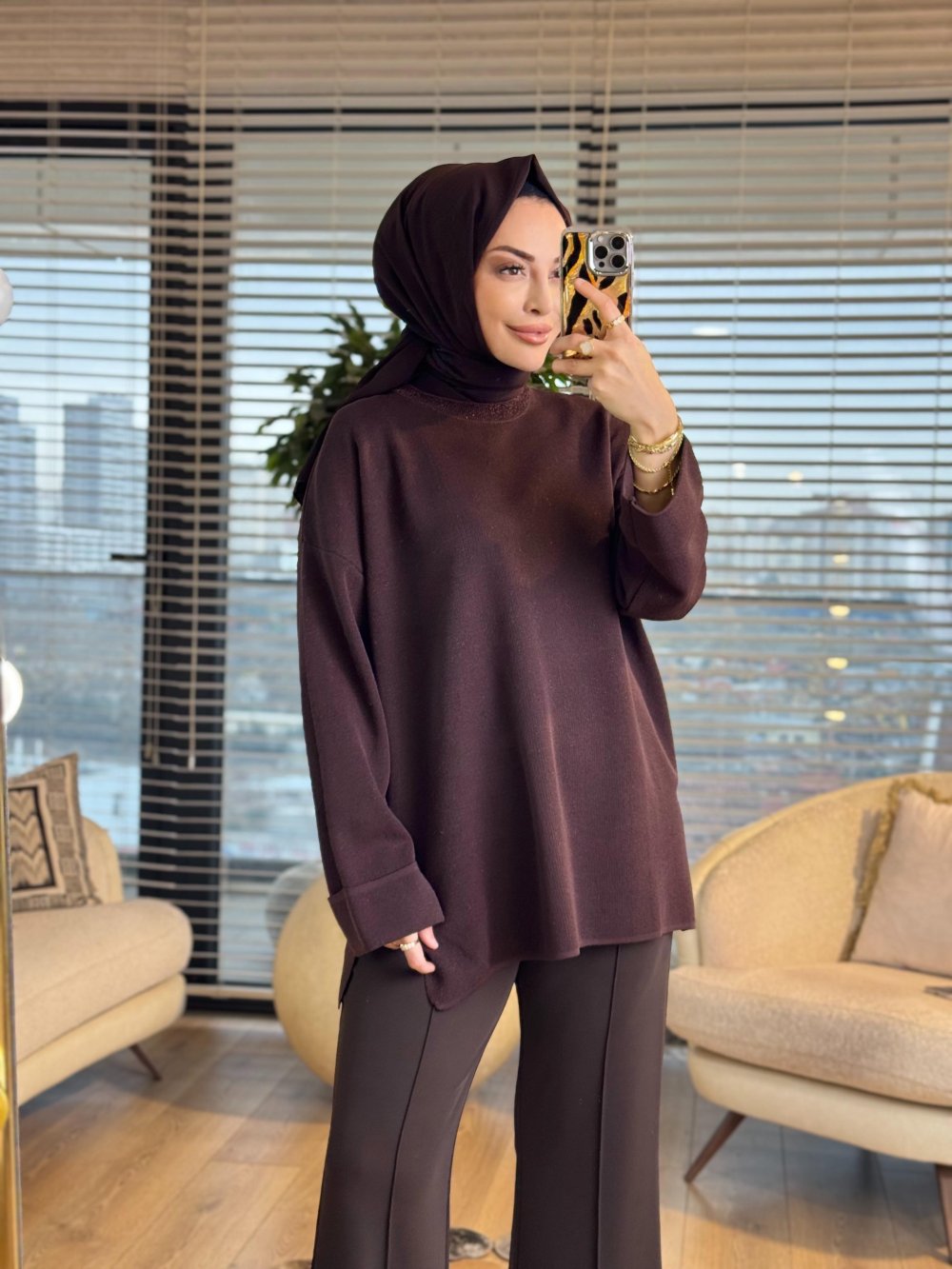 44186 Kolları Katlamalı Simli Triko Tunik Kahve