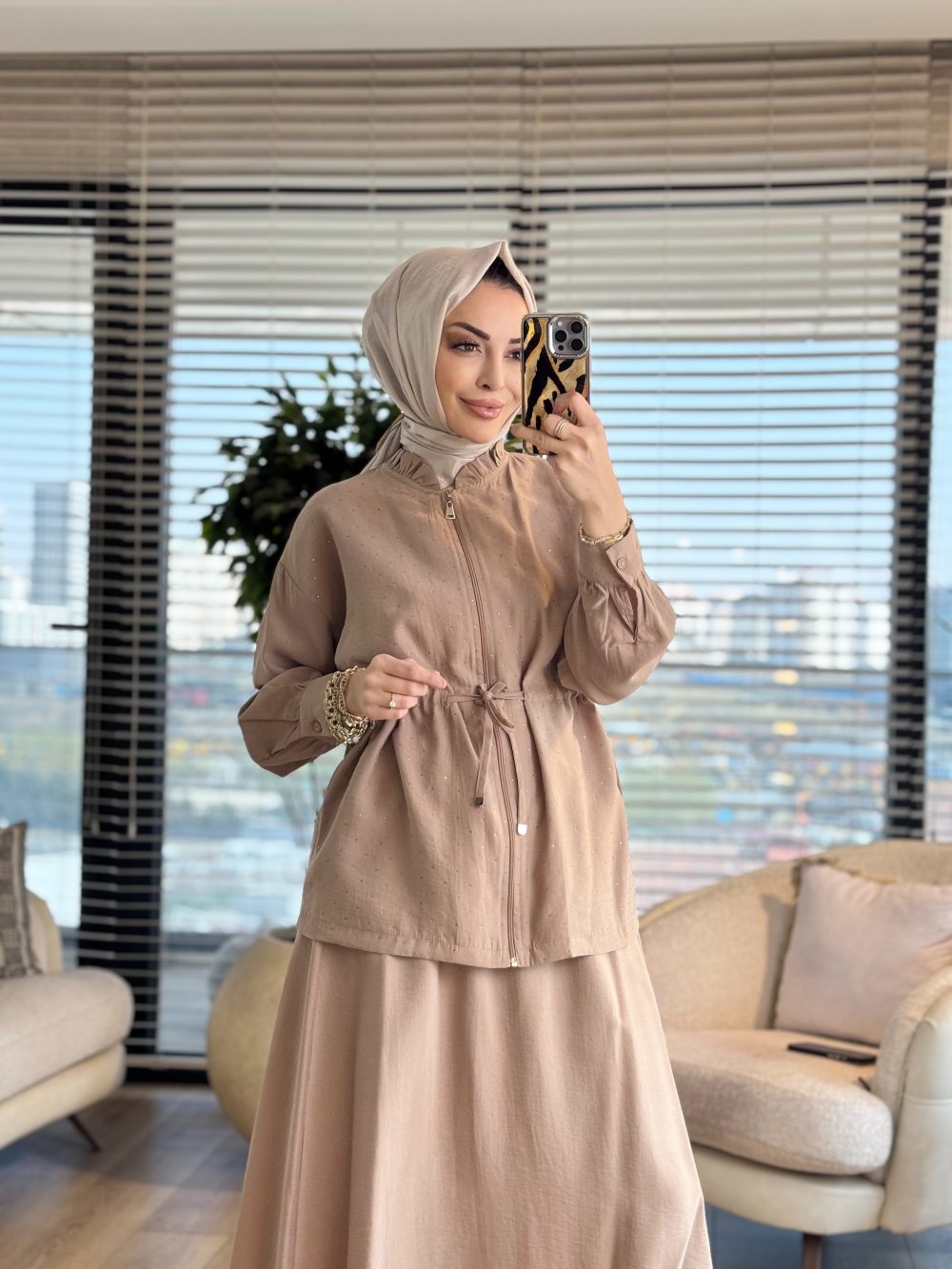 4466 Üstü Serpme Taş Baskılı Etekli Takım Bej