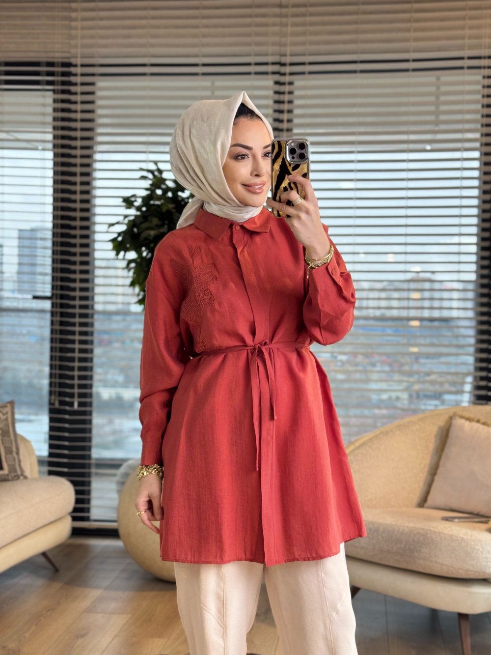 4471 Sol Göğüs Kordon Çiçek Nakışlı Gömlek Kiremit