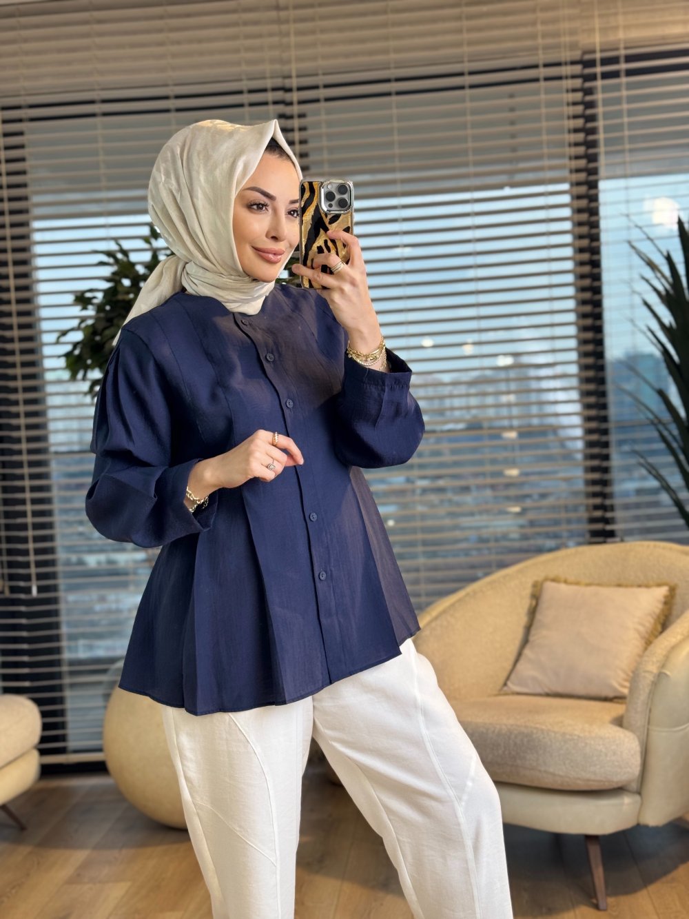 4474 Ön Dikiş Detaylı Yakasız Gömlek Lacivert