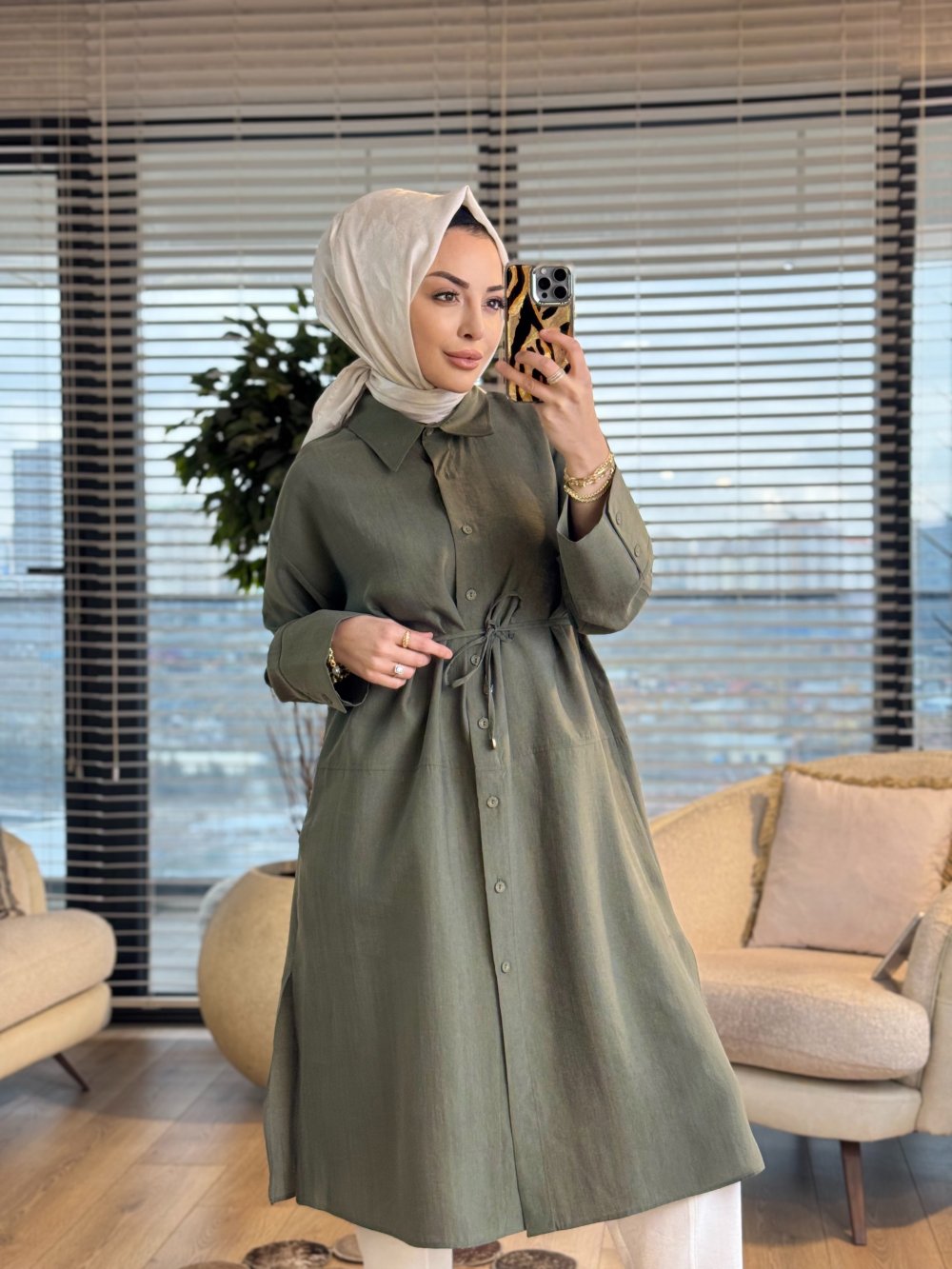 4476 Ön Düğmeli Klasik Uzun Gömlek Yeşil