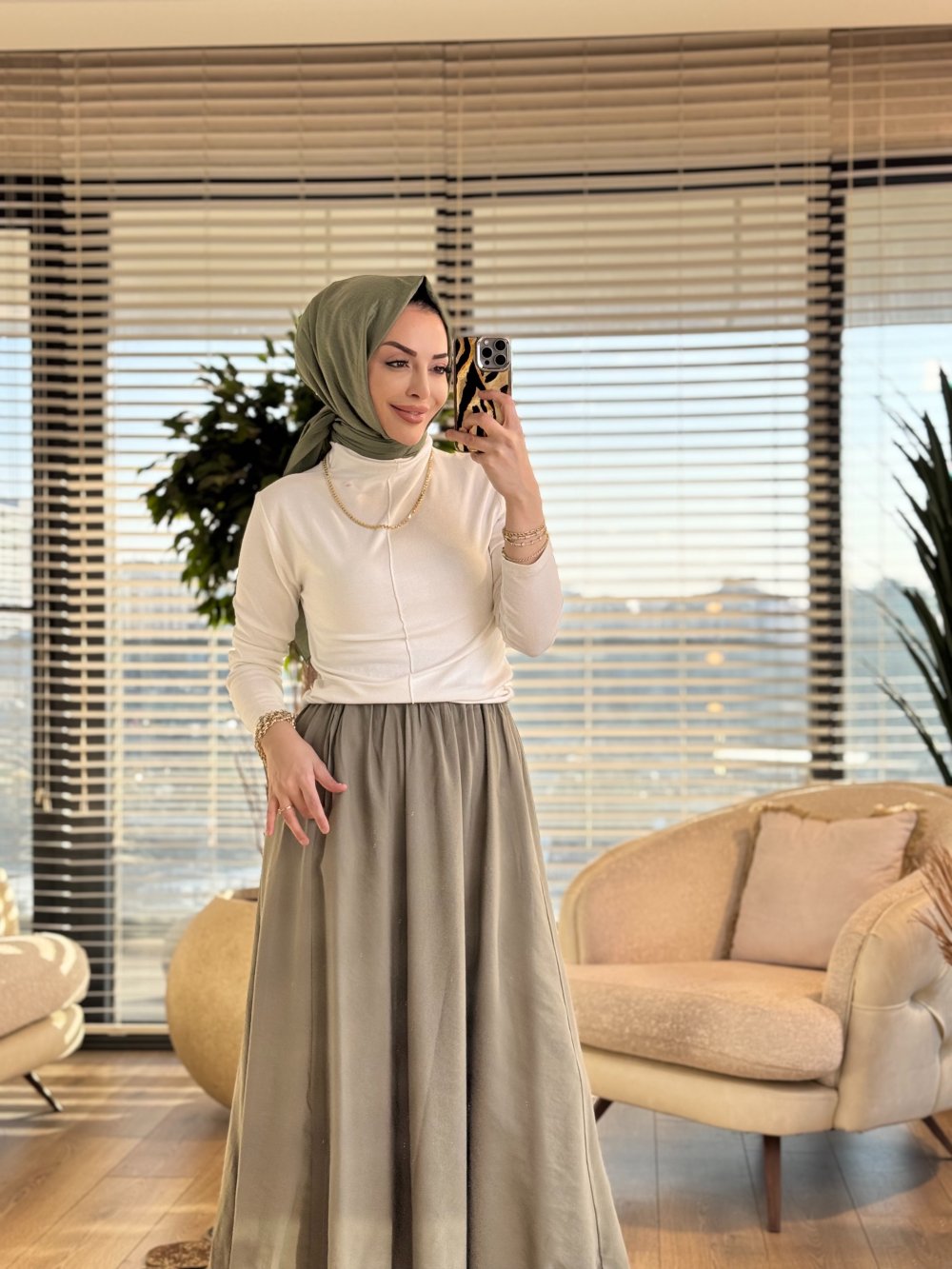 5036 Beli Lastikli Cepli Kırışık Etek Haki