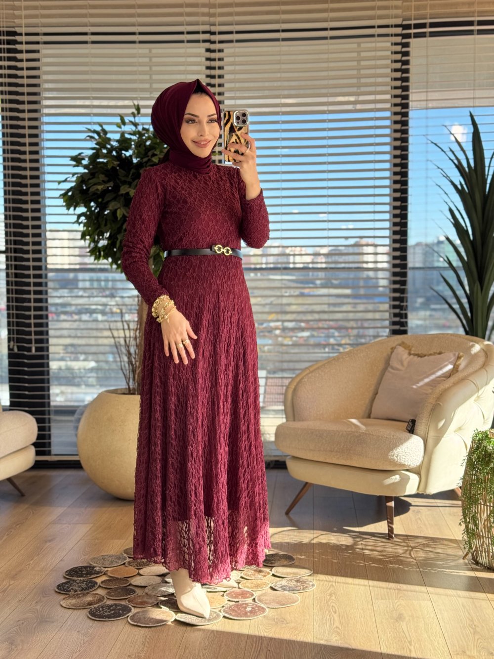 5280 Dantel Kemerli Elbise Bordo