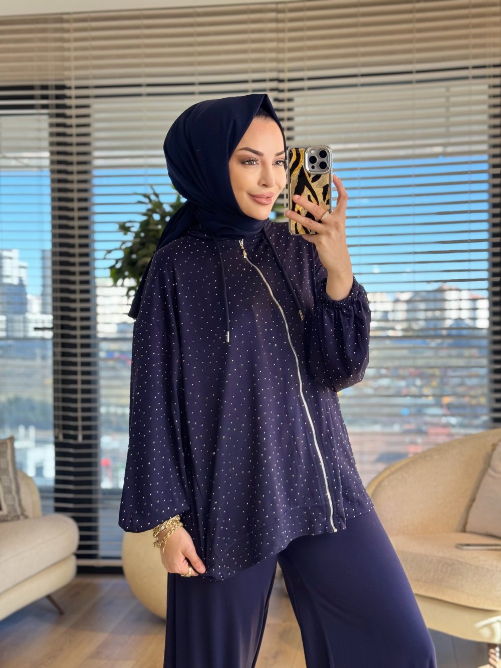 52838 Taş Baskılı Fermuarlı Pantolonlu Takım Lacivert
