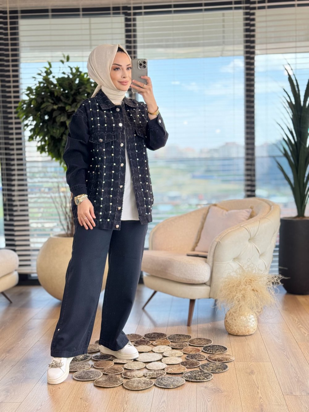 5446 Kare Saçak Üstü Taş İşlemeli Kot Ceket Siyah