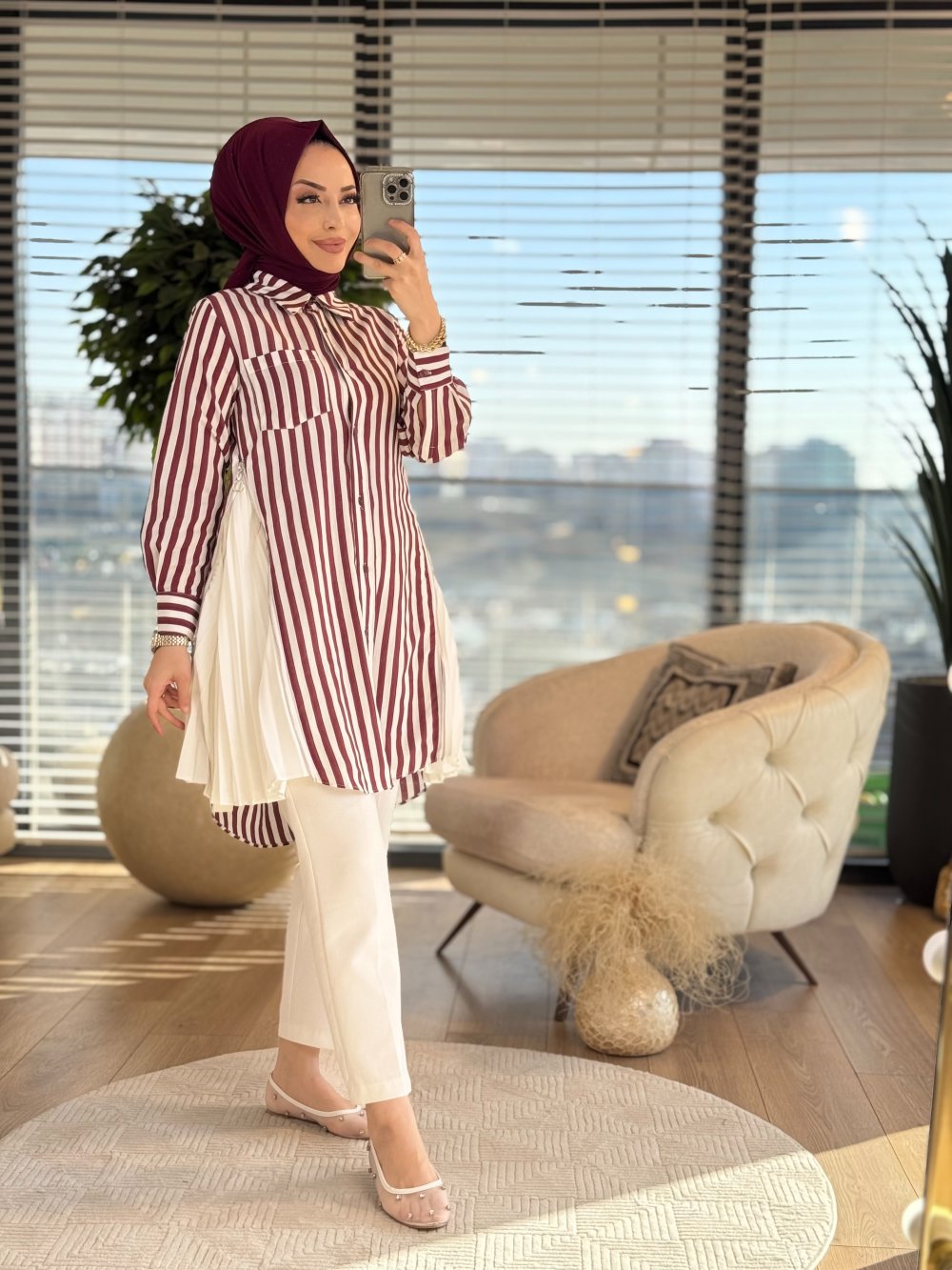 5500 Çizgili Yanları Fermuarlı Ve Piliseli Uzun Gömlek Bordo