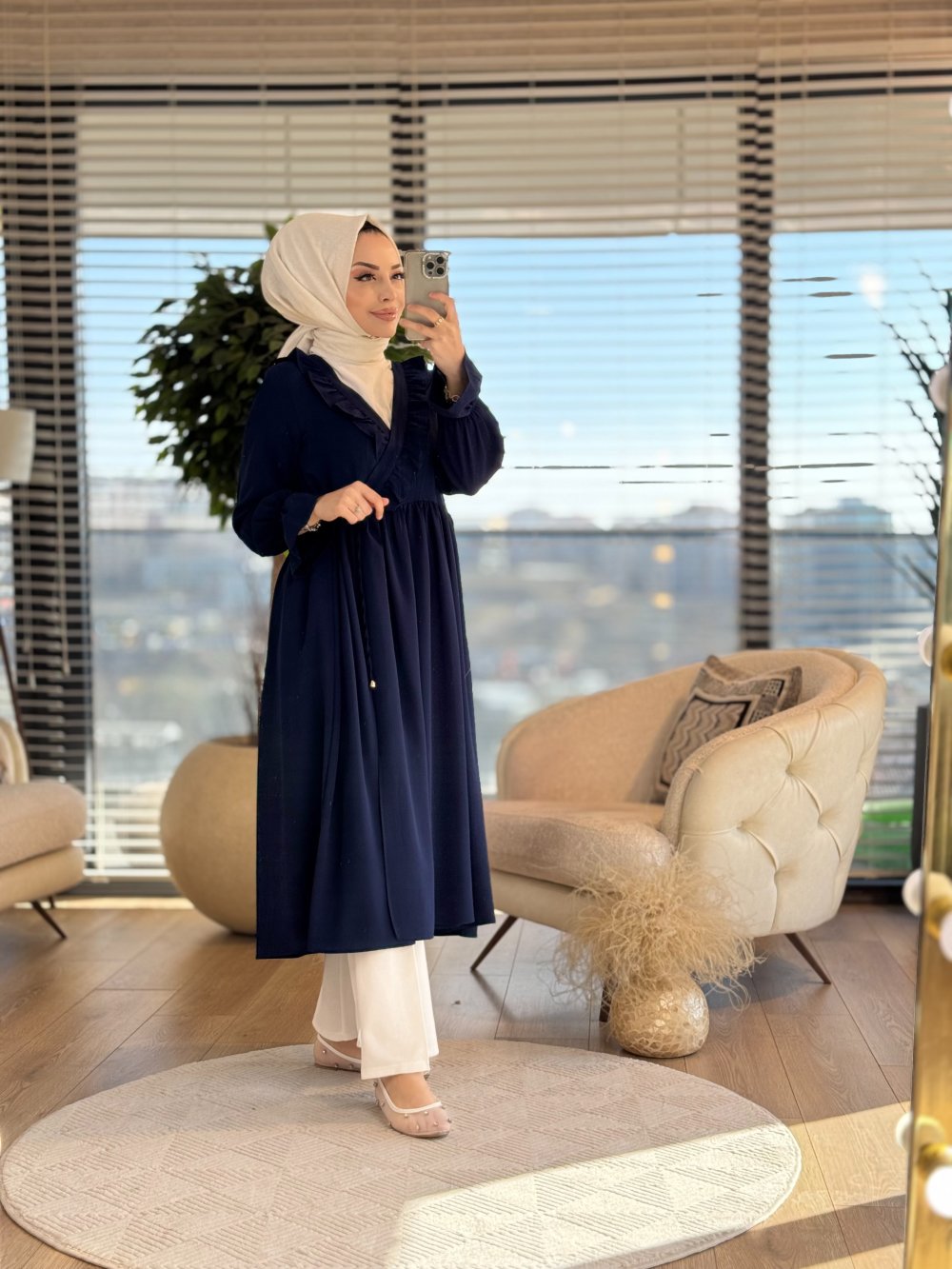 6593 Yandan Bağlamalı Yaka Kenarı Fırfırlı Elbise Lacivert