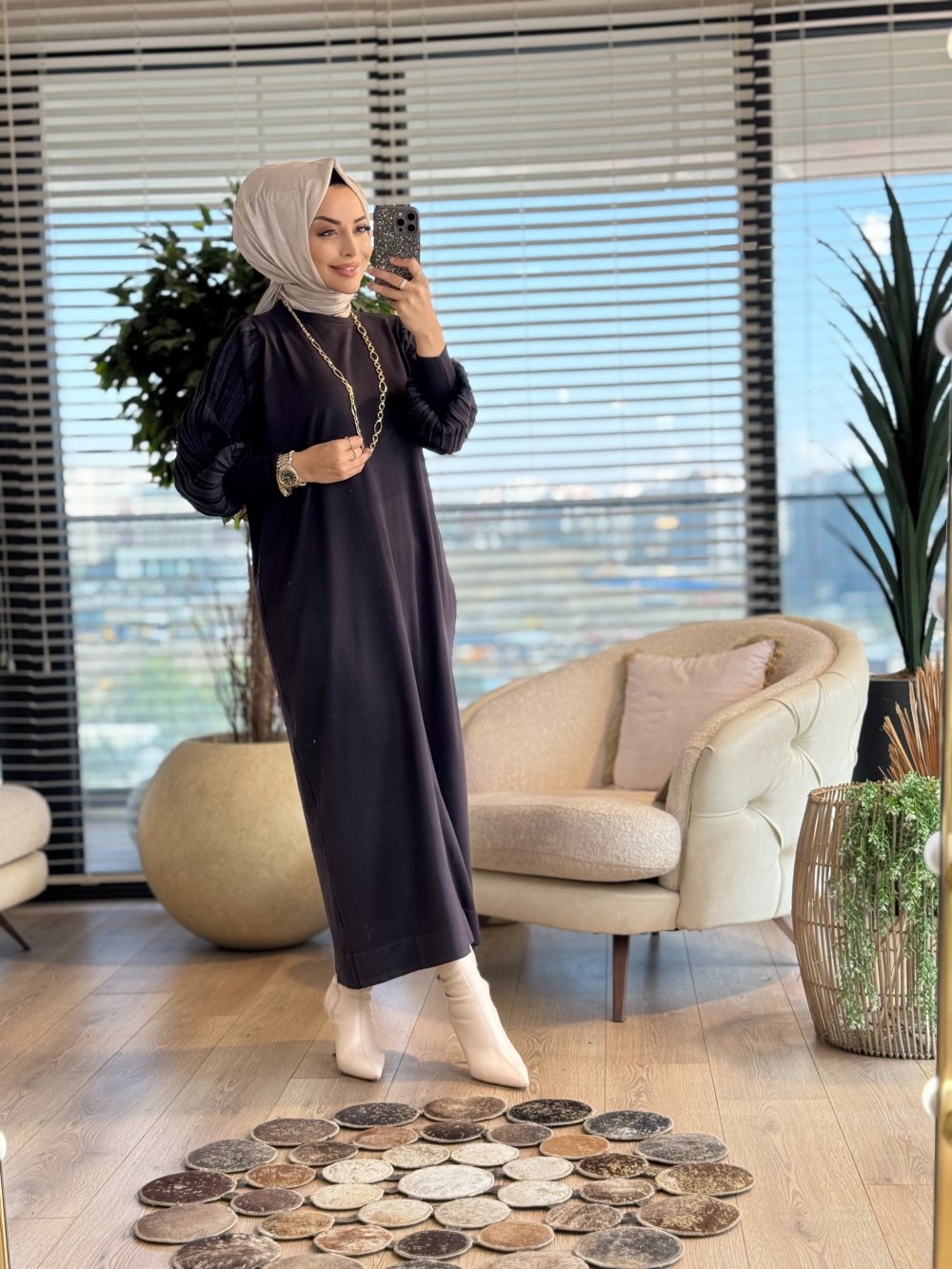7046 Kolları Piliseli Simli Vanezia Elbise Antrasit
