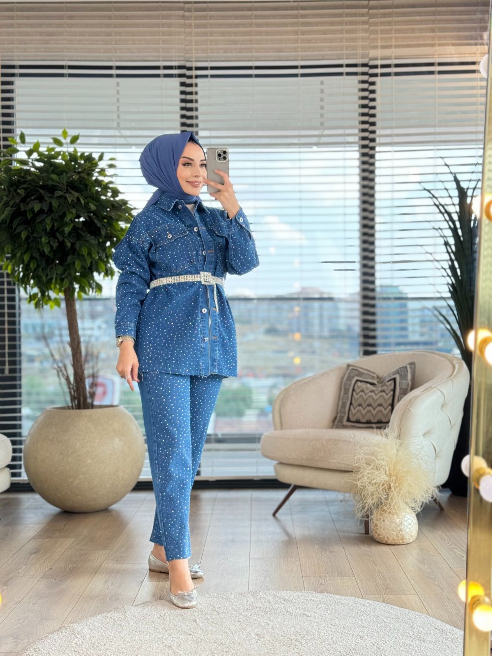 7198 Üstü Taş Baskı Kemerli Kot Takım Mavi