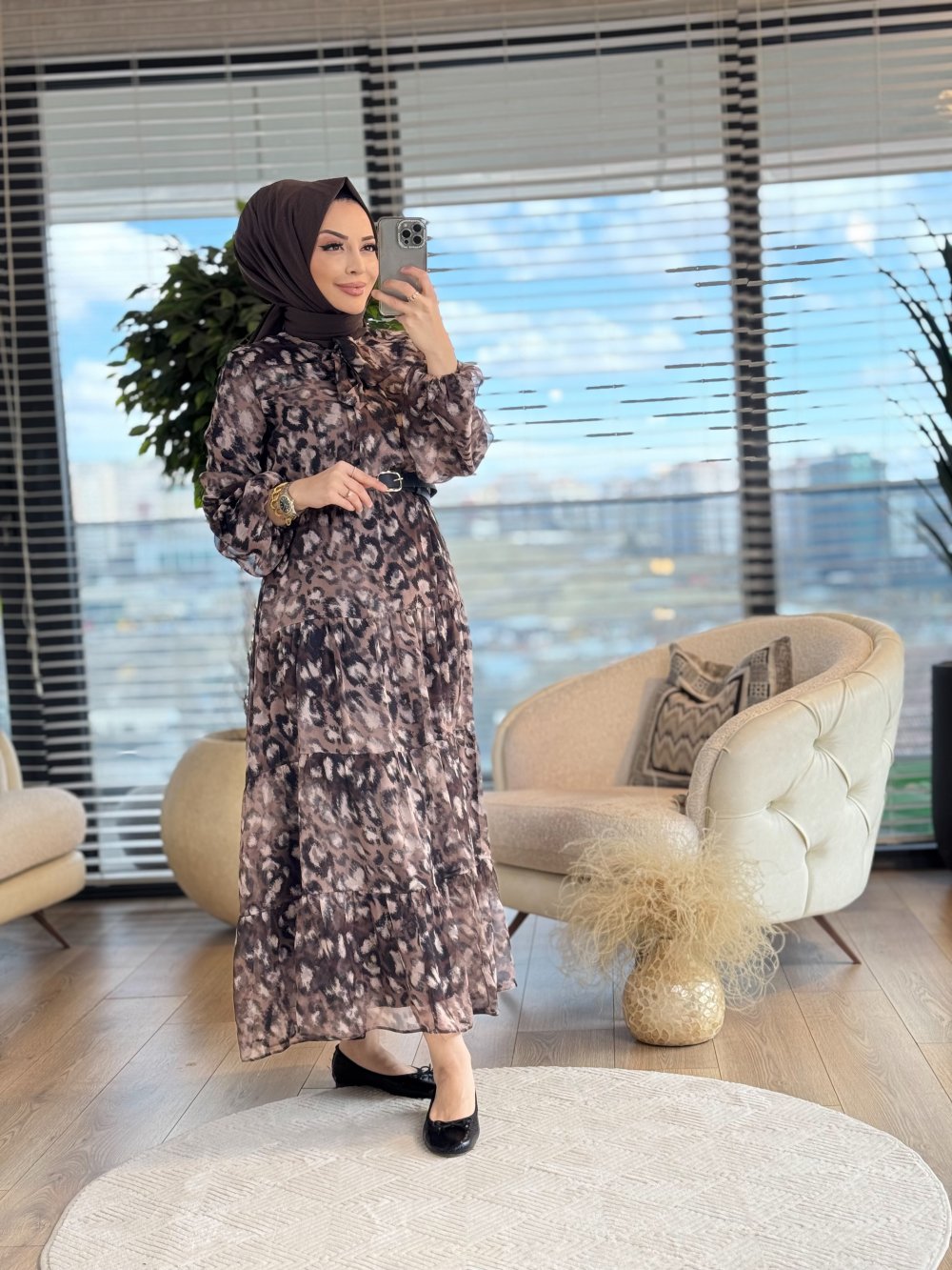 7246 Leopar desen Yaka Bağlamalı Elbise Leopar