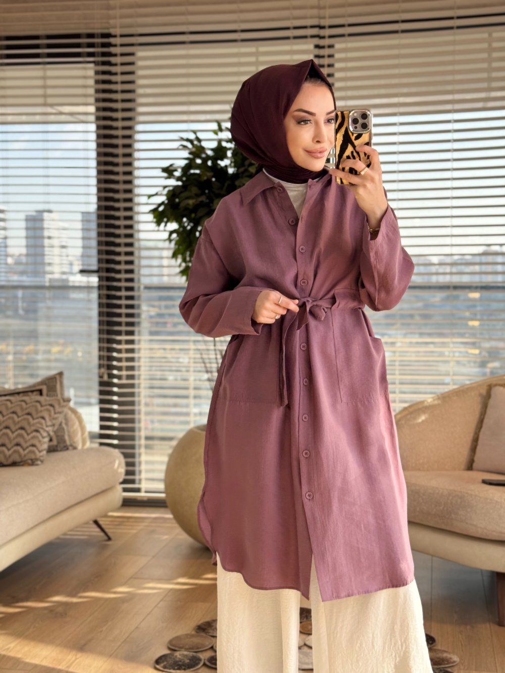 7501 Ön Düğmeli Kuşaklı Uzun Tunik Gül