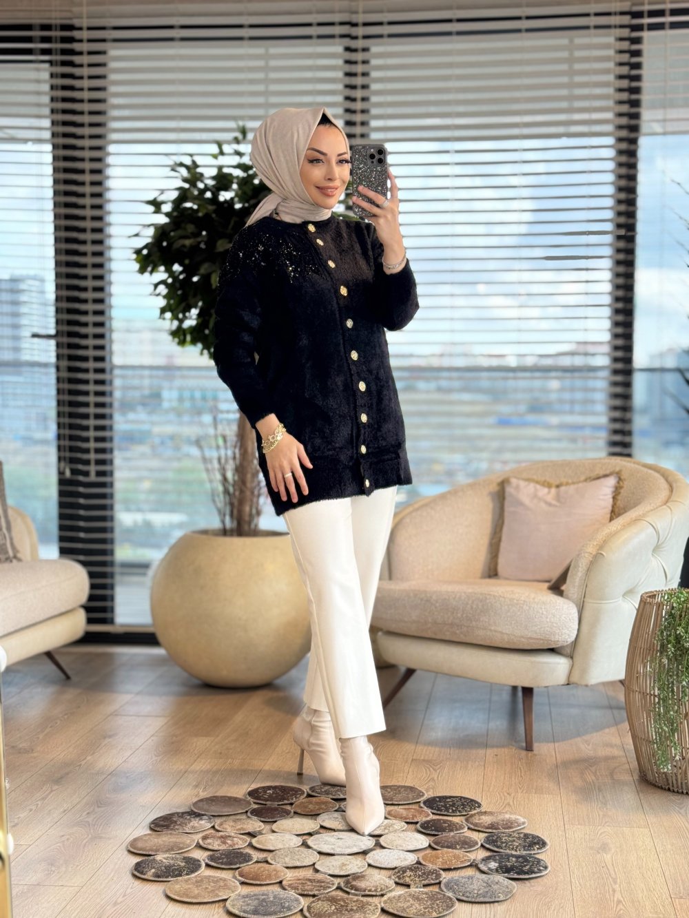 7701 Angora Boncuklu Oversize Hırka Siyah