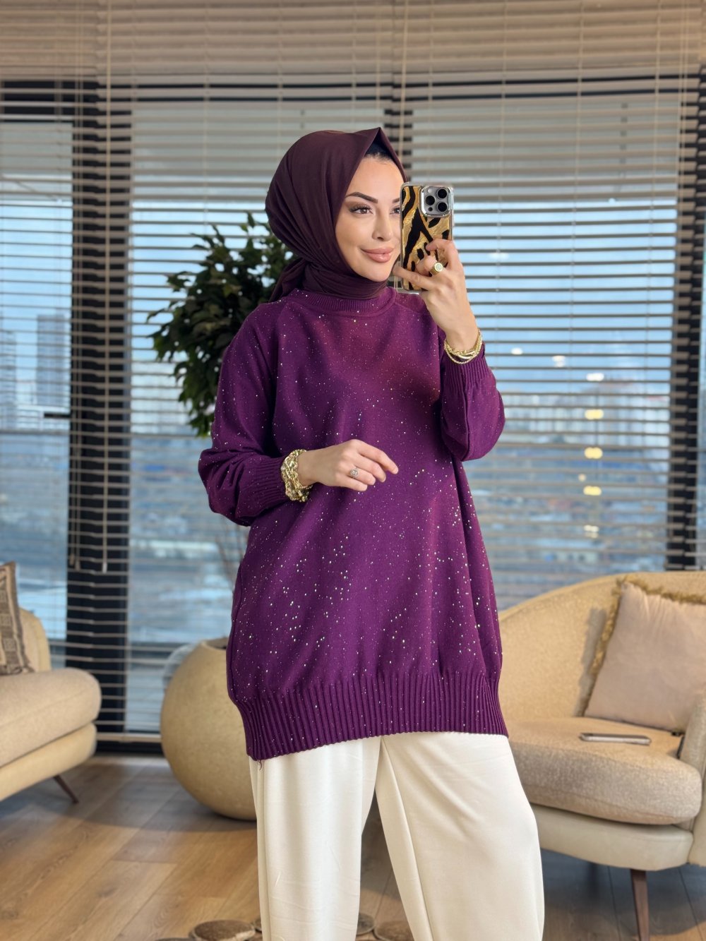 7880 Üstü Serpme Taşlı Triko Tunik Mor