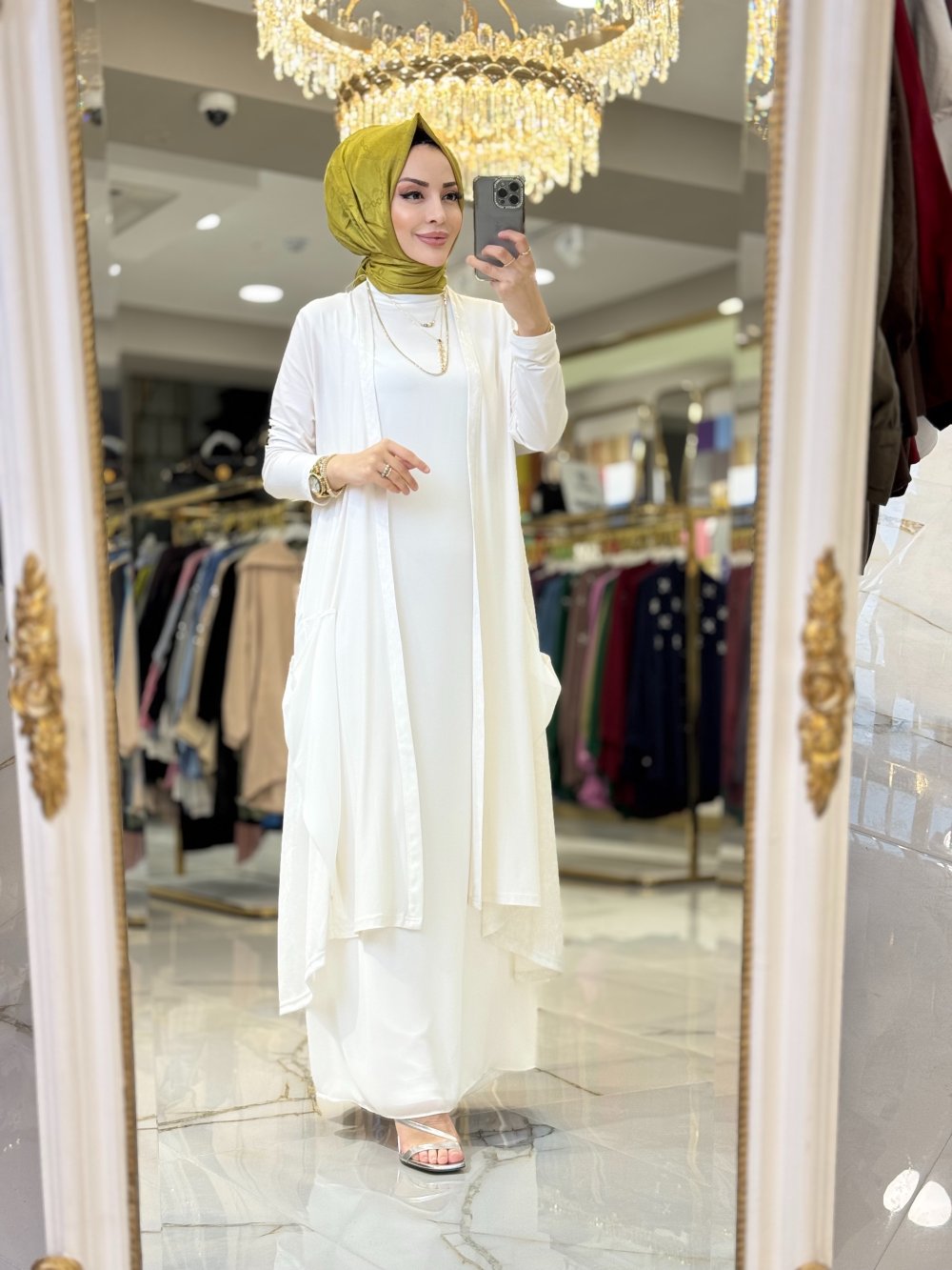 798 Garni Şifonlu Asimetrik Uzun Ceket Ekru