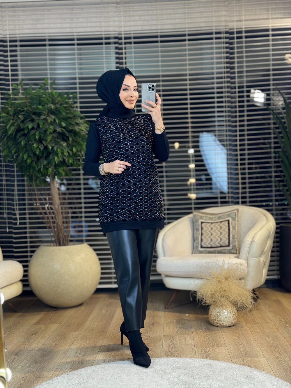 7990 Ön Baklava Taş Kadife Nakışlı Triko Tunik Siyah