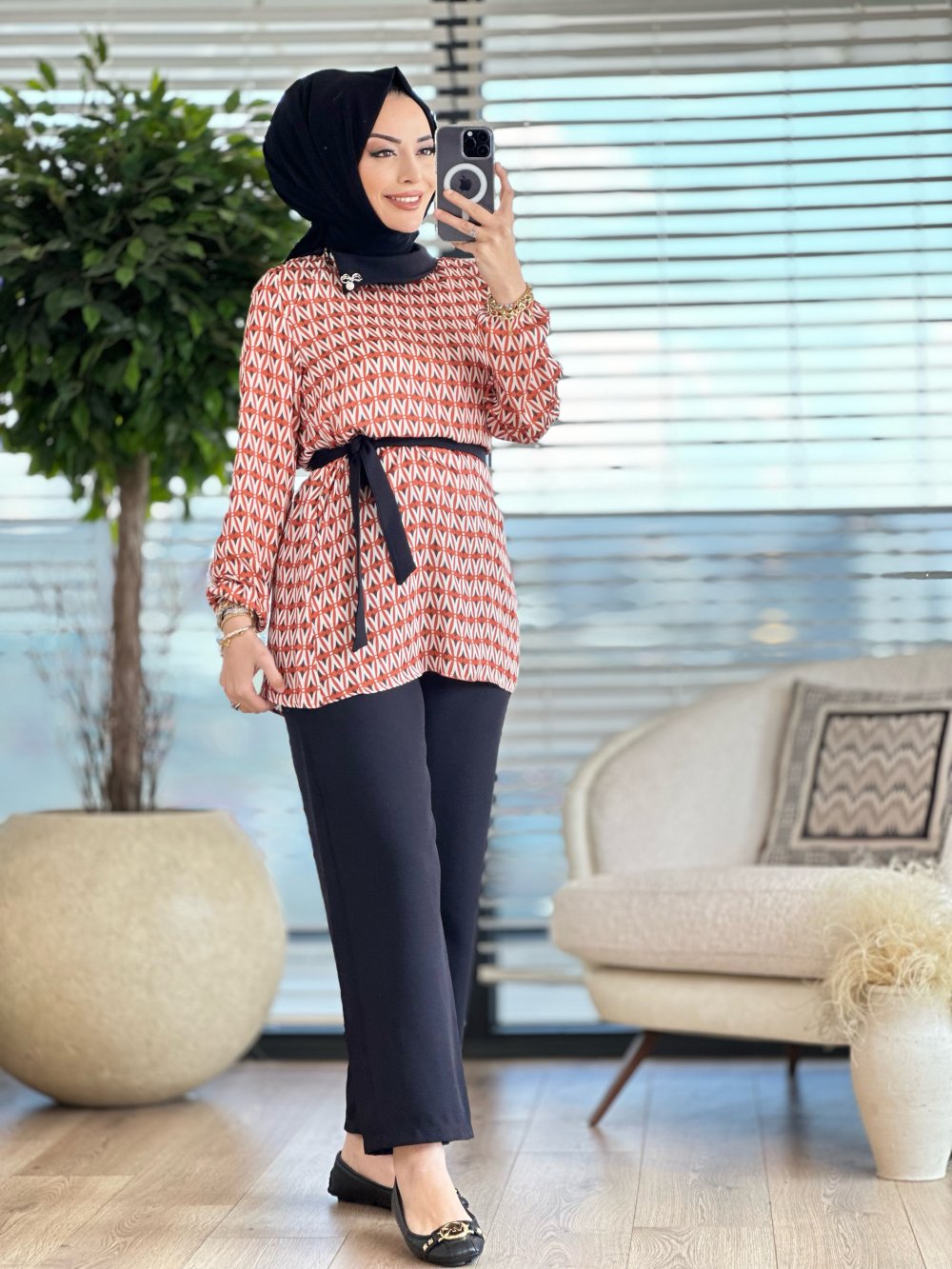 8148 Üst Desenli Devrik Yaka Takım Kiremit