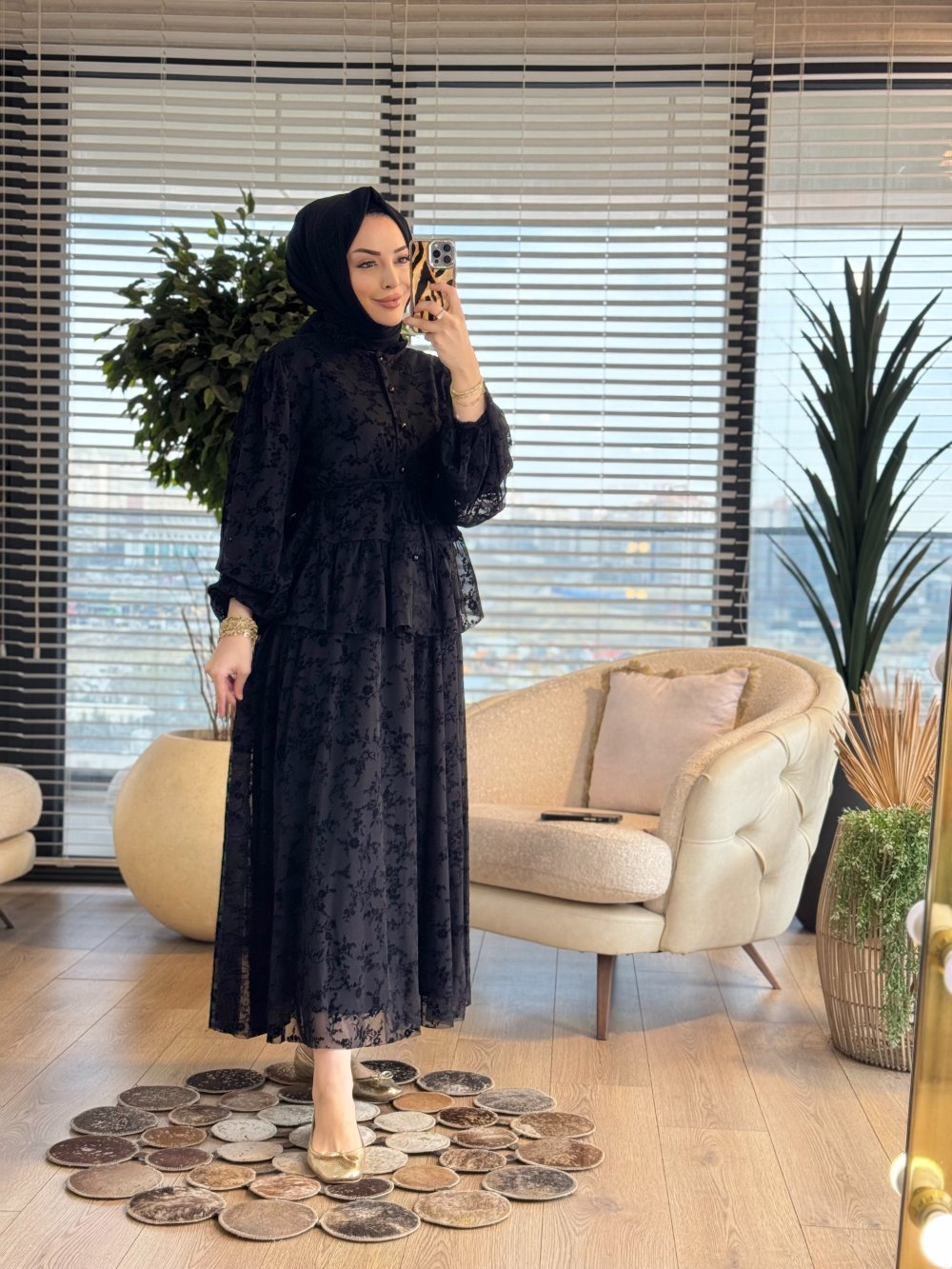 825 Şifon Üstü Kadife Kabartmalı Takım Siyah