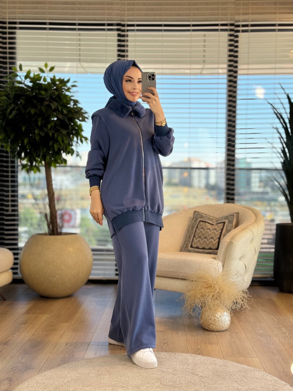 8451 Yaka Kürk Ön Ferm.Omuz Parça Takım İndigo